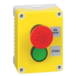 Push-button control station with a red, push-release flush head and green flush head. Includes 1 normally open and 1 normally closed contact block, 2 x M20 threaded and 1 x M20 non-threaded cable entry knockouts.